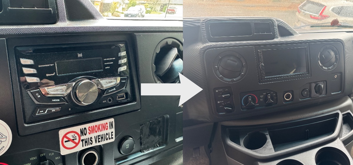 The first step was to clean up the dashboard. The power plugs were all chewed away, and covered in duct tape, and it had a poorly-mounted radio.